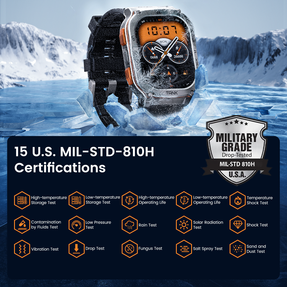 - karinio tvirtumo: 5ATM, IP69K ir MIL-STD 810H - ištvers karštį, šaltį, smūgius, sūrų vandenį, purvą ir t. t.;