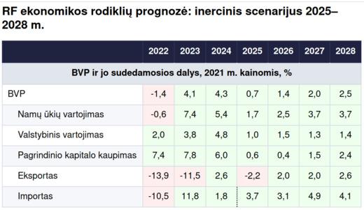 Jei 2024 m. struktūrinis poslinkis į neproduktyvius ekonomikos sektorius dar buvo užtikrinamas jų spartesniu augimu (60 % prieš 40 % visam kitam), tai dabar – 2025 m. – jau mažėja sektoriai, dalyvaujantys vartotojų paklausos tenkinime. Karo, karinės pramonės ir finansų dalis 130 % BVP augime reiškia, kad visa kita parodė, kaip dabar įprasta sakyti Rusijoje, „neigiamą augimą“.