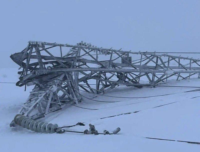 ❗️The cause of the blackout in 🇷🇺Murmansk and 🇷🇺Severomorsk is shown in the photo: 5 power line supports iced over, some of which are 60 years old, could not withstand the load and collapsed.