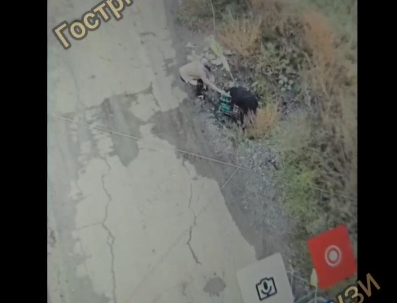Ukrainiečių dronas su atsargomis nusirito į griovį. Tada pasirodė pora vietinių civilių, kurie jį pastatė ant kelio: